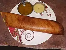 A dosa is a thin savory crepe in South Indian cuisine made from a fermented batter of ground black gram and rice. Dosas are served hot, often with chutney and sambar (a lentil-based vegetable stew).[1] Dosas are popular in South Asia as well as around the world.