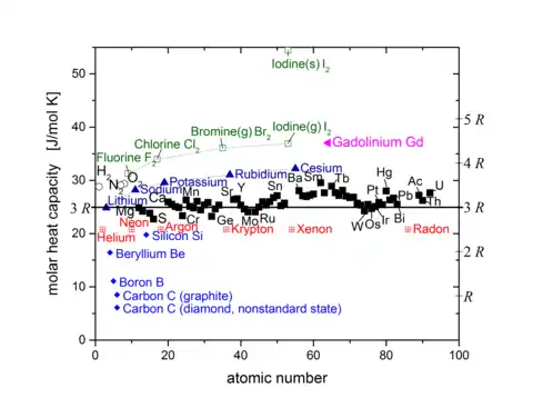 An equivalent statement of the Dulong–Petit law in modern terms is that, regardless of the nature of the substance, the specific heat capacity c of a solid element (measured in joule per kelvin per kilogram) is equal to 3R/M, where R is the gas constant (measured in joule per kelvin per mole) and M is the molar mass (measured in kilogram per mole). Thus, the heat capacity per mole of many elements is 3R.