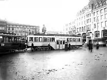 After the nationalization, the company started a renovation process of the infrastructure and rolling stock. Combined with a municipal policy of low fares, the company started going with a loss. Five new trams were delivered from 1948 to 1952, and built at the depot at Holtet, with used equipment from some of the older trams. An additional nine new trams were delivered between 1952 and 1955. Five additional trams were rebuilt from 1955 to 1960, by which time all the narrow trams had been rebuilt or retired.[22] The use of a unique voltage gave operational difficulties, as fuses could regularly blow at Oslo Hospital if errors were made while switching from the one supply to the other. In addition, all the trams were custom-built with extra equipment with limited spare parts. All the trams delivered during the 1950s were built so they could later be converted to only use 600 volt supply.[23] The depot was expanded in 1952.[24]