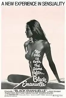 Black Emanuelle (Italian: Emanuelle nera) is a softcore sexploitation film from 1975 directed by Bitto Albertini. The film was set in Africa and shot mostly in Kenya. The music was composed by Nico Fidenco. Black Emanuelle was followed by a number of sequels, all revolving around the erotic adventures of Mae Jordan (played by Laura Gemser), a globe-trotting, hedonistic investigative journalist and photographer known to her readers as "Emanuelle". Her character has been described as "a strong and independent woman, sexually proactive, at the centre of wealthy young and old white men of power, and involved in any sort of depraved set and situation."[2]