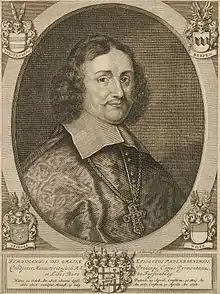 Ferdinand of Fürstenberg (German: Ferdinand Freiherr von Furstenberg), contemporaneously also known as Ferdinandus liber baro de Furstenberg, (26 October 1626 - 26 June 1683) was, as Ferdinand II, Prince Bishop of Paderborn from 1661 to 1683 and also Prince Bishop of Münster from 1678 to 1683, having been its coadjutor since 1667/68. He brought almost complete restoration to the Bishopric of Paderborn after the devastation of the Thirty Years' War.