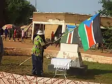 The flag of South Sudan was adopted following the signing of the Comprehensive Peace Agreement that ended the Second Sudanese Civil War.[1] A similar version of the flag was previously used as the flag of the Sudan People's Liberation Movement. The flag of South Sudan predates the country, as the flag was adopted in 2005, while the country became independent in 2011.[2][3]