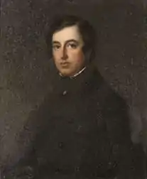 "Portrait of a gentleman of the Knight family, bust-length, in a black coat and white shirt, an extensive landscape beyond"; English School, 19th century. (Christie's catalogue entry). Sold 8 January 2008 with four other portraits of Knight family, property of the Sebright Educational Trust. Possibly a portrait of one of the brothers of Sir Frederic Winn Knight (d.1897)