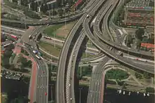 Complex roundabout interchange Kleinpolderplein in Rotterdam, the Netherlands. 51°55′53″N 4°26′19″E / 51.931498°N 4.438479°E / 51.931498; 4.438479