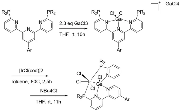 Gallylenes can be used to prepare gallane hydride species, which can act as a source of two hydrides and also a strong electron donor to stabilize resulting high-oxidation state transition metal hydride complexes. Aldridge et al. demonstrated this reactivity by preparing an Ir(IV) complex coordinated to four hydrides, a bidentate phosphorus ligand, and the NacNacGa ligand.[12]
