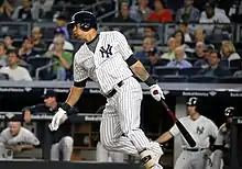On April 8, 2017, Sánchez left the game after straining his right brachialis muscle in the bicep and was placed on the 10-day disabled list.[28][29] He returned to the Yankees on May 5 after missing 21 games.[30] On June 10, Sánchez hit the hardest home run of his career, a 115.1-mph laser to left-center field against Mike Wright of the Baltimore Orioles. The following day, Sánchez hit the farthest home run of his career, a 450-foot shot off Kevin Gausman of the Orioles.[31] Sánchez was named to the 2017 American League All-Star team, his first, as a reserve.[32] He participated in the 2017 MLB Home Run Derby, upsetting Miami Marlins outfielder and future teammate Giancarlo Stanton 17–16 in the first round before losing to Minnesota Twins third baseman Miguel Sanó 11–10 in the second round.[33] Prior to the competition, Sánchez engaged in a feud with Tampa Bay Rays first baseman Logan Morrison, who stated that Sánchez did not deserve an invitation to the Derby, having hit only 13 home runs so far compared to Morrison's 24.[34] Sánchez responded by saying "It's not my fault he didn't get selected."[35]
