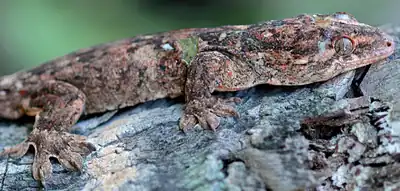 A large, stoutly built gecko. The size from snout to vent is 112 millimetres (4.4 in), plus the tail length of 75 mm (3.0 in). It has a brown color with five dark brown saddle patches between forelimbs and base of tail. The ventral side is light brown with a yellow hue. Iris is brown. The color can vary by showing yellow, reddish and olive elements. The tail has five to six dark bands, which are especially distinct in juveniles and less distinct on adults. Males grow larger than females and have precloacal-femoral pores. Like most geckos, they are oviparous, i.e. reproduce by laying eggs.