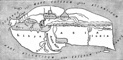 5–6The inhabited world is an island shaped like a truncated cone, in a spherical quadrilateral formed between the equator, the arctic circle and a great circle passing through the poles. The island is 70,000 stadia long by 30,000 stadia wide.