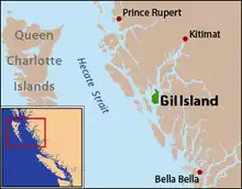 Gil Island is an island on the North Coast of British Columbia, Canada, located on the west side of Whale Channel in the entrance to Douglas Channel, one of the main coastal inlets, on the route of the Inside Passage between Pitt Island and Princess Royal Island. It is 26 km (16 mi) long, with a width ranging from 6 to 13 km (4 to 8 mi), and an area of 231 km2 (89 sq mi). The only named summit on the mountainous island is Mount Gil, which faces the opening of Douglas Channel.[1]