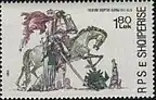 The name Gjergj is the Albanian rendering of George, which is pronounced by Bosniaks the same way as in Albanian, but spelled as Đerđ/Djerdj in Bosnian. The name Gjergjelez have been explained as a compound of Gjergj and Elez, the latter corresponding to the name of the prophet Iliaz (Elias). The tripartite-compound names such as the case of Gjergj Elez Alia are typically found in northern Albanian tribes as well as in some southern Albanian mountain peoples.[4] The third part of the compound name, Ali, is an Ottoman Turkish name of Arabic origin, meaning "high, noble", which is used to highlight a peculiar trait of this legendary character.[5]