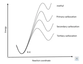 Therefore, since the tertiary carbocation is relatively stable and therefore close in energy to the R-X reactant, then the tertiary transition state will have a structure that is fairly similar to the R-X reactant. In terms of the graph of reaction coordinate versus energy, this is shown by the fact that the tertiary transition state is further to the left than the other transition states. In contrast, the energy of a methyl carbocation is very high, and therefore the structure of the transition state is more similar to the intermediate carbocation than to the R-X reactant. Accordingly, the methyl transition state is very far to the right.