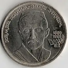 After Hamza's death, the government tried to rename Shohimardon to Hamzobod, but the name never gained much traction.[64] Statues of him were erected throughout the Uzbek SSR. To honor his memory, in 1967 the Central Committee of the Communist Party of Uzbekistan established the State Hamza Prize to recognize outstanding achievement in literature, arts, and architecture.[65] Many institutions in Uzbekistan, including a station of Tashkent Metro (renamed in 2015), the Uzbek State Academic Drama Theater,[66] as well as schools, clubs, farms and streets were named after him.[67][68] In 1989, a Soviet coin featuring an image of Hamza was issued in honor of his 100th birthday.[69]