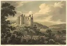 The original entrance to the castle lay on the west side, guarded by a gatehouse but no trace of this survives. Round towers are located on the north-west and south-west corners, and in the south-east corner there is a square tower with an additional projecting turret. The south-west and south-east towers have three storeys, with the south-east tower possessing a basement and postern gate which could serve as a counter-attack during a siege.[5] A large hall lies the south of the castle with great, high windows and scaling ladders. Little remains of the original medieval defences in the outer ward of the castle, although the extensive curtain wall has been upkept and still remains along with a considerable part of the north side, including a semicircular turret and a square tower to the east.[5]