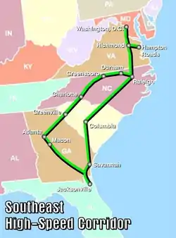 The Southeast High-Speed Rail Corridor is a passenger rail transportation project to extend high-speed passenger rail services from Washington, D.C., south through Richmond and Petersburg in Virginia through Raleigh and Charlotte in North Carolina and connect with the existing high-speed rail corridor from DC to Boston, Massachusetts known as the Northeast Corridor. Since first established in 1992, the U.S. Department of Transportation (USDOT) has since extended the corridor to Atlanta and Macon, Georgia; Greenville, South Carolina; Columbia, South Carolina; Jacksonville, Florida; and Birmingham, Alabama.
