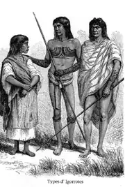 Tattoos were known as batuk (or batok) or patik among the Visayan people; batik, buri, or tatak (compare with Samoan tatau) among the Tagalog people; buri among the Pangasinan, Kapampangan, and Bicolano people; batek, butak, or burik among the Ilocano people; batek, batok, batak, fatek, whatok (also spelled fatok), or buri among the various Igorot peoples;[44][45][55] and pangotoeb (also spelled pa-ngo-túb, pengeteb, or pengetev) among the various Manobo peoples.[56][57] These terms were also applied to identical designs used in woven textiles, pottery, and decorations for shields, tool and weapon handles, musical instruments, and others.[44][45][55] Most of the names are derived from Proto-Austronesian *beCik ("tattoo") and *patik ("mottled pattern").[58][59]