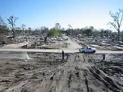 This picture shows the destruction of the 9th Ward after Katrina. Thousands of people displaced by their homes.