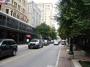The road now known as "Houston" was originally called "Rivas Street" east of the river and "El Paseo del Rio" west of it. The two sections formed what was essentially a backroad with limited commercial development.[1] Historically, most of the town's business flowed through the Alameda — now "Commerce Street".[2][3] The Alameda was the city's most important thoroughfare, as it connected the two town squares: Alamo Plaza and Main Plaza.[2] For the first century and a half of its existence, this road prospered as the city's main street and center of gravity. However, by the late 19th century, Commerce Street had become overburdened by grime, congestion, and the stench of mule and horse-drawn vehicles.[1][2]