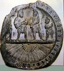 Jain votive plates, called "Ayagapatas", are numerous, and some of the earliest ones have been dated to circa 50-20 BCE.[35] They were probably prototypes for the first known Mathura images of the Buddha.[36] Many of them were found around the Kankali Tila Jain stupa in Mathura.