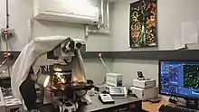 Intravital microscopy setup. Confocal microscope to collect images and PC monitor to display images generated. Equipment required to keep the animal under anaesthesia and to monitor its body temperature is not shown