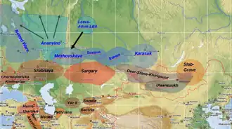 In general, migration wave of Andronovo cultural-historical community tribes, where their physical type (anthropologically ascended to the Southern Eurasian Anthropological Formation), conflated with local tribes (anthropologically ascended to the Northern Eurasian Anthropological Formation) and went on ethnogenesis of the Andronoid cultures.[7] The phenotype features of Irmen people are distinctive, they developed from the local Eneolithic culture, in its formation participated Caucasoid population of Eastern Mediterranean type, migrants from Central Asia.[8]