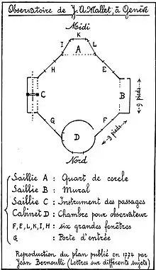 For the structure's design, Mallet had departed from a traditional, utilitarian plan,[NB 1] instead building a single-story octagon, capped with a drum and small dome.[43][47] To furnish the observatory, Mallet purchased and installed a 10-foot achromatic telescope, likely manufactured by the English optician John Dollond, a high-precision clock from the French maître Jean-André Lepaute, and a meridian bezel, crafted by Jeremiah Sisson, to better calculate the duration of Earth's rotation for timekeeping.[7][29][49] With his pupils and assistants, including Marc-Auguste Pictet and Jean Trembley, Mallet continued to observe celestial objects and bodies, and their interactions with each other and the Earth.[7] In May 1772, Mallet was appointed as a corresponding member of the Académie des sciences by Jérôme Lalande.[50] As a correspondent, Mallet was seen as effective, meticulous, and dependable.[1]