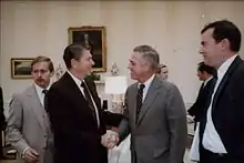 In the spring of 1974, with the Watergate scandal continuing to grow in magnitude and seriousness, Buckley surprised and, in some cases, angered some of his allies among Republicans when he called upon the increasingly-embattled Richard M. Nixon to voluntarily resign the presidency.[39] Buckley said that in doing so, he was making no judgment as to Nixon's technical legal guilt or innocence of the accusations made against him and in fact denounced those "in and out of the media who have been exploiting the Watergate affair so recklessly" in what he called an effort "to subvert the decisive mandate of the 1972 election." However, he said that the burgeoning scandal might result in an impeachment process that would tear the country even further apart and so he declared: "There is one way and one way only by which the crisis can be resolved, and the country pulled out of the Watergate swamp. I propose an extraordinary act of statesmanship and courage—an act at once noble and heartbreaking; at once serving the greater interests of the nation, the institution of the Presidency, and the stated goals for which he so successfully campaigned"—Nixon's resignation.[40] Buckley was the first major conservative figure to call for resignation. Nixon did not resign at that time but eventually did lose the support of key Republican figures, including Senator Barry Goldwater.[41] Nixon ultimately resigned on August 9, 1974.[42]
