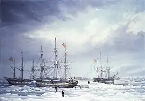 Jane (middle vessel), Middleton, and Viewforth stuck fast in the ice. Thomas Binks (1799–1852). Maritime Museum, Hull