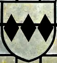 Arms of Tuckfield: Argent, three lozenges in fess sable. Detail from 19th century heraldic stained-glass window in Holy Cross Church, Crediton