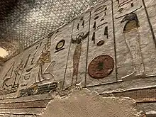 The burial chamber is an eight-pillared hall in which stood the red quartzite sarcophagus (the box of which is now in the Louvre, while its lid is in the Fitzwilliam Museum in Cambridge).[1] This chamber is decorated with Book of Gates, divine scenes and the Book of the Earth. Beyond this is a further set of annexes decorated with the Book of Gates. The outside of the sarcophagus features two scenes from the Amduat.[2]