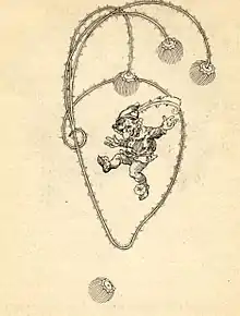 Grimm has provided one of the earlier and more commonly accepted etymologies for kobold,[5] tracing the word's origin through the Latin cobalus to the Greek koba'los, meaning "rogue". The change to the word-final -olt is a feature of the German language used for monsters and supernatural beings. Variants of kobold appear as early as the 13th century.[20] The words goblin and gobelin, rendered in Medieval Latin as gobelinus,[21] may in fact derive from the word kobold or from kofewalt.[18][22] Related terms occur in Dutch, such as kabout, kabot, and kaboutermanneken.[14] Citing this evidence, British antiquarian Charles Hardwick has argued that the house kobold and similar creatures, such as the Scottish bogie, French goblin, and English Puck, all descend from the Greek kobaloi, creatures "whose sole delite consists in perplexing the human race, and evoking those harmless terrors that constantly hover round the minds of the timid."[23] In keeping with Grimm's definition, the kobaloi were spirits invoked by rogues.[24] Similarly, British writer Archibald Maclaren has suggested that kobold beliefs descend from the ancient Roman custom of worshipping lares, household gods, and penates, gods of the house and its supplies.[25]