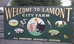 Lamont Farm Project was founded in 1977 and opened in 1979 by local man Charlie Doran.[2] The farm is a registered charity and is Scotland's first city farm.[3][2][4] It is home to domesticated animals including llamas, sheep, pigs, horses, ponies, donkeys, ducks, rabbits, ferrets and other small furry animals and cats.[1] The farm also has a small reptile enclosure for snakes, iguanas, terrapins and spiders.[5]