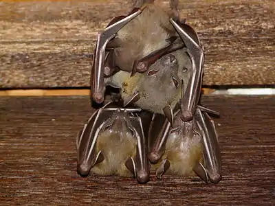 The lesser short-nosed fruit bat (Cynopterus brachyotis) is a species of megabat within the family Pteropodidae.[2] It is a small bat that lives in South Asia and Southeast Asia. It weighs between 21 and 32 grams (0.74 and 1.13 oz), and measures 70 to 127 millimetres (2.8 to 5.0 in).[3] It occurs in many types of habitat, but most frequently in disturbed forest, including lower montane forest and tropical lowland rain forest, plus gardens, mangroves, and vegetation on beaches.[4]