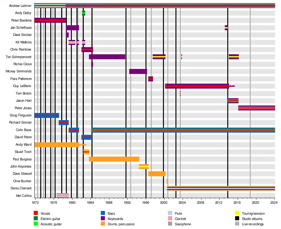 | Dave Sinclair | 1978–1979 | Breathless (1978) – two tracks only | ||