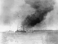 Much like battlecruisers, battleships typically sank with large loss of life if and when they were destroyed in battle. The first battleship to be sunk by gunfire alone,[4] the Russian battleship Oslyabya, sank with half of her crew at the Battle of Tsushima when the ship was pummeled by a seemingly endless stream of Japanese shells striking the ship repeatedly, killing crew with direct hits to several guns, the conning tower, and the water line or below it, which became the cause of the ship's sinking.[5][6] Battleships also proved to be very vulnerable to mines, as was evidenced in the Russo-Japanese War and both World Wars. After the Battle of Port Arthur,[7] a number of Russian and Japanese vessels were struck by mines and either sank or were scuttled to prevent their capture. A decade later, the Marine Nationale and Royal Navy lost three battleships, HMS Irresistible, HMS Ocean, and Bouvet, to Turkish mines in the waters of the Dardanelles. Torpedoes were also very capable of sinking battleships. On 21 November 1944, USS Sealion sank Kongō with over 1200 casualties.[8] HMS Barham was struck by three torpedoes fired from German submarine U-331.[lower-alpha 1] Barham could not make an attempt to dodge the incoming torpedoes and sank with 862 fatalities as a result of several magazine explosions that occurred after she had initially been hit by U-331's torpedoes.[11]