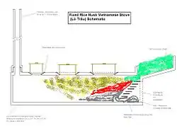 The timeline of the development of the lò trấu is unclear, however, it is known that the Lo Trau has been in use in Vietnam at least since the 1950s. The fixed version Lo Trau stove is thought to be strongly related to the Castrol stove design of the architect François de Cuvilliés in 1735 and similar European designs in the 1830s, with flue pipes connected to the chimney, oven holes into which concentric iron rings on which the pots were placed. Depending on the size of the pot or the heat needed, one could remove the inner rings. A recent innovation is the portable Lo Trau. Its compact design and efficient operation has been the target of a number of studies.[1][2][3][4][5] Recently it has been distributed in the Negros area of the Philippines in The Southern Negros Sustainable Agriculture Demonstration Projects in the 1990s.[1] This relatively late uptake of apparently long-used innovation means the potential of rice husk as fuel has been overlooked by many for a long time, as well as the obscurity of the Lo Trau designs to the wider world.