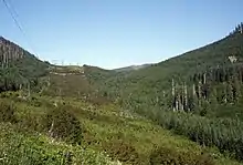 At 3,415 feet (1,041 m), it provides a much lower crossing of the Cascade Range near Mount Hood than the 4,650-foot (1,420 m) Oregon Route 35 Bennett Pass on the southeast side. Access from the southwest side of the pass is paved all the way to the pass, where the road changes to gravel, heading down the northeast side of the pass. Lolo Pass Road (Forest Road 18) is closed due to heavy snow each winter. The road through the pass was initially established by Native Americans, as a trading route connecting the Willamette Valley and sites at the eastern end of the Columbia River Gorge like Celilo Falls. In 1838, Daniel Lee (nephew of missionary Jason Lee) drove livestock across the pass, while traveling east to establish a new Methodist station, named Wascopam Mission.[2] He was the first westerner known to have used the trail. The trail was then used as one of the final legs of the Oregon Trail; settlers arriving from The Dalles would often drive their livestock over the pass while their families floated down the river. The 1846 construction of the Barlow Road provided a less daunting alternate route around the south side of Mount Hood.[3]