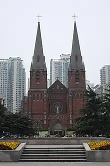 Around this time, Zhang served first as the dean of Saint Peter's Church, Shanghai, and then as the acting rector of Xujiahui Seminary.[3] In April 1960, the Shanghai CPA elected Zhang as the bishop of the Diocese of Shanghai.[16] On the 26th of the month, Zhang was consecrated bishop under the self-election, self-consecration principle by Archbishop Ignatius Pi Shushi and Bishop Francis Xavier Zhao Zhensheng, along with Matthias Wu Guohuan, Shu Qishei, and Fang Zhigang.[17] The ceremony happened at St. Ignatius Church, Xujiahui, which became the cathedral of the Diocese of Shanghai since then.[18] According to Mariani, Rome denounced Zhang's consecration.[19] Zhang was also elected as the vice chair of the Shanghai CPA, subordinate to the chairman Hu Wenayao.[20] In summer 1960, Zhang told an Italian journalist that he and Rome were not in touch with each other.[19] According to Aloysius Jin Luxian, during this period of Zhang's episcopate, he could only write dossiers to explain his own background or expose other people.[21]