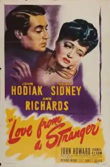 Love from a Stranger is a 1947 American historical film noir directed by Richard Whorf and starring John Hodiak, Sylvia Sidney and Ann Richards.[2] The film is also known as A Stranger Walked In in the United Kingdom. It is based on the play of the same title by Frank Vosper, inspired by a short story by Agatha Christie, which had previously been turned into a 1937 British film Love from a Stranger starring Basil Rathbone.