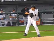 In 2004, Buehrle led the American League in innings pitched with 245+13, in games started with 35, and in complete games with five.[11] He ranked among the AL leaders in quality starts (third, 23), walks per nine innings (fifth, 1.87), wins (tied sixth, 16), strikeout to-walk ratio (seventh, 3.24), ERA (eighth, 3.89) and strikeouts (ninth, 165).[11] Buehrle lasted at least six innings in each of his last 28 starts. On July 21 in Cleveland, he faced the minimum 27 batters in a two-hit shutout of the Indians.[12]