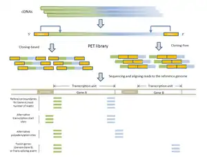 4. RNA-PET: This application is used for studying the transcriptome: transcripts, gene structures, and gene expressions.[1][10] The PET library is generated using full length cDNAs, so the ditags represent the 5’ capped and the 3’ polyA tail signatures of individual transcripts. Therefore, RNA-PET is especially useful for demarcating the boundaries of transcription units. This will help identify alternative transcription start sites and polyadenylation sites of genes.[1] RNA-PET could also be used to detect fusion genes and trans-splicing, but further experiment is needed to distinguish between them.[11] Other methods of finding the boundaries of transcripts include the single-tag strategies CAGE, SAGE, and the most recent SuperSAGE, with the CAGE and 5’ SAGE defining the transcription start sites and the 3’ SAGE defining the polyadenylation sites.[1] The advantages of PET sequencing over these methods are that PET identify both ends of the transcripts and, at the same time, provide more specificity when mapping back to the genome. Sequencing the cDNAs can reveal the structures of transcripts in great details, but this approach is much more expensive than RNA-PET sequencing, especially for characterizing the whole transcriptome.[10] The major limitation of RNA-PET is the lack of information regarding the organization of the internal exons of transcripts. Therefore, RNA-PET is not suitable for detecting alternative splicing. In addition, if the cloning procedure is used construct the cDNA library before generating the PETs, cDNAs that are difficult to clone (as a result of long transcripts) would have lower coverage.[10] Similarly, transcripts (or transcript isoforms) with low expression levels would likely be under-represented as well.