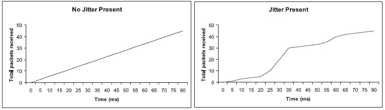 If packets are delayed by the network, some packets arrive in bursts with interpacket delays shorter than when they were transmitted, while others are delayed such that they arrive with greater delay between packets than when they were transmitted from the source (see figure below). This time difference between when a packet actually arrives and the expected arrival time is defined as packet jitter or time distortion.[3]