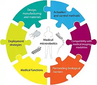 The design of an untethered microscopic mobile machine or microrobot to function in vivo with medical interventional capabilities should assume an integrated approach where design 3D body shape, material composition, manufacturing technique, deployment strategy, actuation and control methods, imaging modality, permeation of biological barriers, and the execution of the prescribed medical tasks need to be considered altogether, as illustrated in the diagram on the right above. Each of these essential aspects contains a special design consideration, which must be reflected at the physical design of the microrobot.[189]