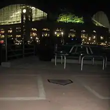 The final major league game at County Stadium was on September 28, 2000;[43] Warren Spahn threw out the first pitch to Del Crandall, and also in attendance were Willie Davis, Hank Aaron, and Robin Yount.[44] The Brewers were defeated by the Cincinnati Reds 8-1 in that game. After the game, there was a closing ceremony, where first home plate and the pitching rubber of County Stadium were removed, to be placed at Miller Park. Then, former Braves, Brewers, and Packers legends who had played at County Stadium during its history were introduced by broadcasters Earl Gillespie, Merle Harmon, and Bob Uecker, with Uecker delivering the closing speech, as each of the stadium's light towers were symbolically turned off. The stadium was demolished on February 21, 2001. Although most of the stadium site is now covered with parking for Miller Park, the site of the old infield was converted into a Little League park, and is now called Helfaer Field. On a picnic concourse next to the playing field of Helfaer Field, there is an outline of where home plate was at County Stadium and also a bronze marker in the nearby parking lot marking where Hank Aaron's 755th and final career home run landed.