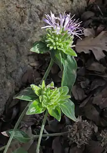 In general, Monardella viridis is a perennial herb producing a hairy erect or decumbent stem lined with pairs of oval leaves with woolly undersides. The inflorescence is a head of several flowers blooming in a small cup of rough-haired, leaflike bracts. The light pink or purple flowers are between 1 and 2 centimeters long.