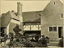 The house was built in a U-shape around a courtyard open on its north side. The west wing contained Jekyll's workshops, and to the east lay a service wing. On the house's south, garden elevation, the tiled roof extends down to the top of the ground floor, broken by two large gables.[24] On the right of this elevation, a narrow, south-projecting porch wing has an arch, the house's main entrance, on its east side, where this wing forms a continuation of the house's east facade.[25]