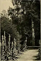 Jekyll transformed Munstead Wood gradually over many years.[3] She allowed the felled woodland to grow back, but thinned the young trees,[9] creating areas of different varieties and different combinations of varieties,[10] and gave each area its own underplantings of flowers and shrubs. The resulting woodland garden was viewed via a series of long woodland walks.[3] Nearer the house the woods merged gradually into lawns.[6] Seasonal gardens flowered in succession through the year: the "spring garden", the "hidden garden", the "June garden",[11] and the main herbaceous border, 200 feet (61 m) long, which flowered from July until October.[12] Each garden displayed carefully arranged shades of colour.[13]