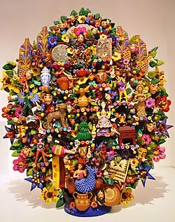 Tree of life whose theme is crafts. Sculpture display at the Museum de Artes Populares in Mexico City by Oscar Soteno.