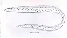 The spotted snake eel (Myrichthys tigrinus), also known as the tiger snake eel or the spotted tiger snake eel,[1] is an eel in the family Ophichthidae (worm/snake eels).[2] It was described by Charles Frédéric Girard in 1859. It is a marine, tropical eel which is known from the eastern central and southeastern Pacific Ocean, including Chile, Costa Rica, Colombia, El Salvador, Ecuador, Mexico, Guatemala, Nicaragua, Panama, Honduras, and Peru.[3] It dwells at a depth range of 0 to 60 metres (0 to 197 ft), and inhabits benthic sediments of mud and sand. Males can reach a maximum total length of 74 centimetres (29 in), but more commonly reach a TL of 60 centimetres (24 in).[2]