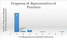 The frequency for the number of seats reserved for provinces. The majority of electoral provinces have two seats reserved, while few have more than two.