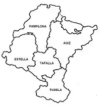 During the entire Restauración period Navarre was divided into 5 electoral districts, territorially roughly corresponding to the existing judicial districts;[1] 4 of them (Estella, Aoiz, Tafalla and Tudela) were categorized as “distritos rurales” with one mandate each, and 1 (Pamplona) enjoyed the status of a “circunscripción” with 3 mandates available. In both types of districts mandates were assigned according to the first-past-the-post system. In the 20th century the comarca of Améscoas was moved from the Pamplona district to the Estella district.[2]